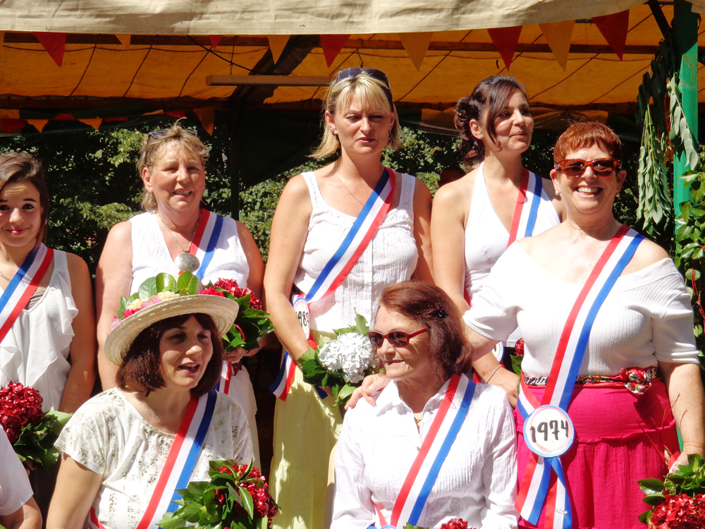 This year Frederique had the wonderful idea to invite all of the former Miss Bourdeilles that could be gathered up to join in the parade. Finding no written record of former participants there were a lot of threads to be followed, sisters and cousins to be quizzed, where does so and so live now, could her second cousin once removed give her a call for us........and then arms to be gently twisted. In the end there was a lovely turn out of beautiful women. From Miss Bourdeilles 1954 all the way up to 2013.