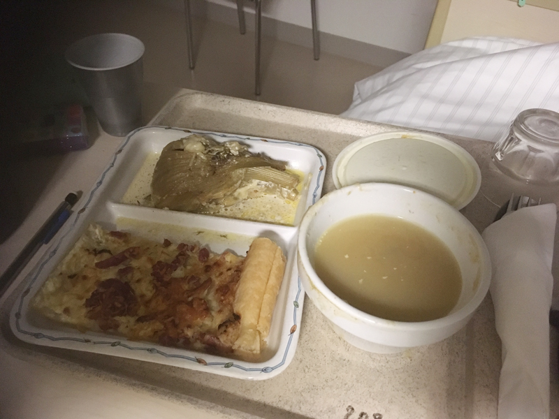 Only a few hours later it was 6:00 PM sharp and there was my dinner tray. Surprised to be coherent enough to eat I gobbled up a delicious broiled cheese fennel and a slice of pizza. I could only muster up enthusiasm for a few spoonfuls of broth. Woe is me, wine is not offered for the post-op dinner.